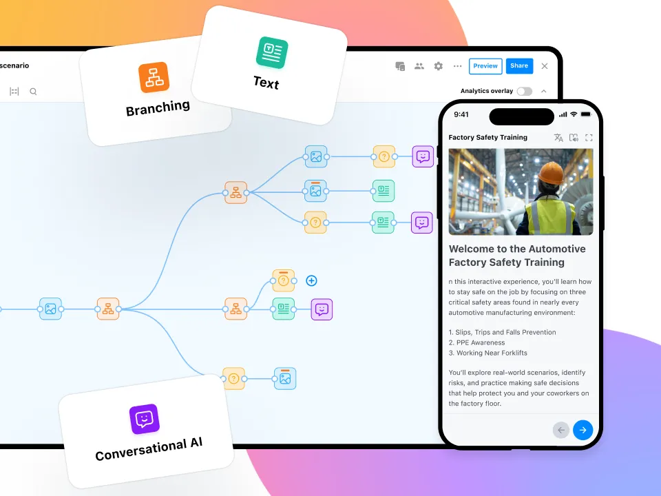 Guide employees through realistic workplace scenarios with interactive simulations, so new hires can learn by doing in a safe, controlled environment. Use linear paths to introduce key processes step by step, or branching logic to let learners explore decisions and see their consequences. Built-in analytics and xAPI integrations give you insight into learner choices, helping you identify gaps and tailor follow-up training and support.