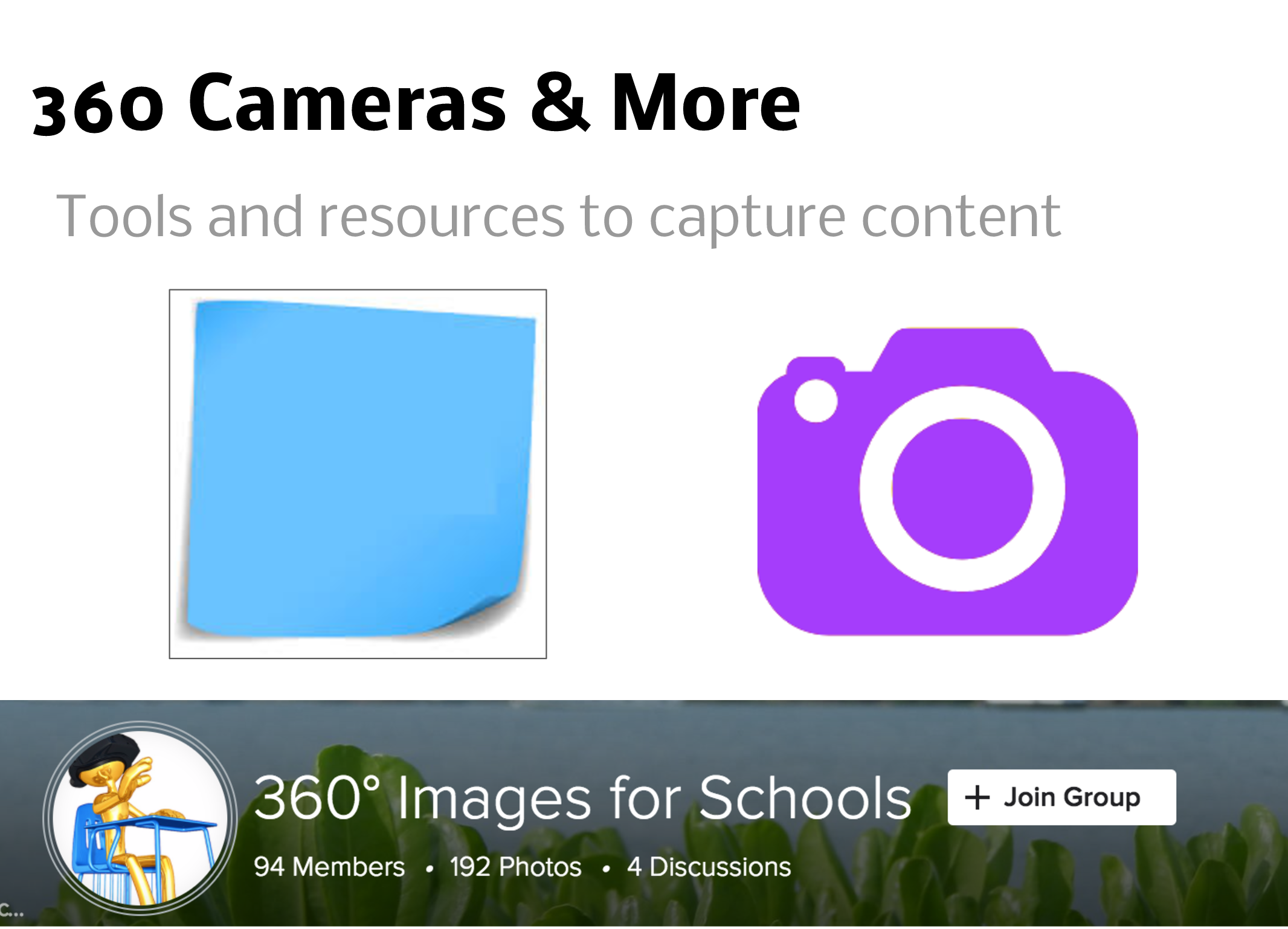 <div><span style="font-size:16px;">360° Images for Schools</span></div><div><br></div><div>An invite-only group to those educators who are taking 360° panoramic images and are willing to Creative Commons-license them (attribution/non-commercial/no derivs) so that teachers and students can use them in various projects. </div><div><br></div> www.flickr.com An invite-only group to those educators who are taking 360° panoramic images and are willing to Creative Commons-license them (attribution/non-commercial/no derivs) so that teachers and students can use them in various projects.